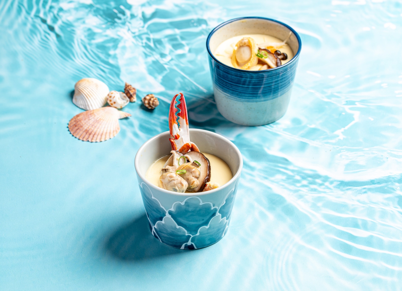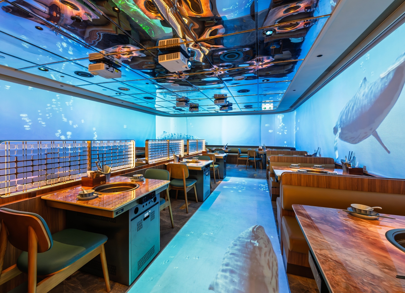 Bathed in shades of aquamarine, the restaurant evokes the calm beauty of the sea. Gentle lighting dances across flowing lines and elegant curves, creating a soothing, romantic ambience. Every corner is thoughtfully designed — from the seating layout to the subtle play of light — offering guests a tranquil retreat to relax, connect, and savour each moment.